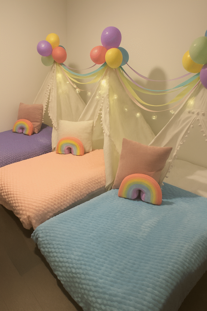 Our package includes tents, air mattresses, sheets, blankets, and small themed tent decorations; extra decorations and party favors may be added at additional cost.